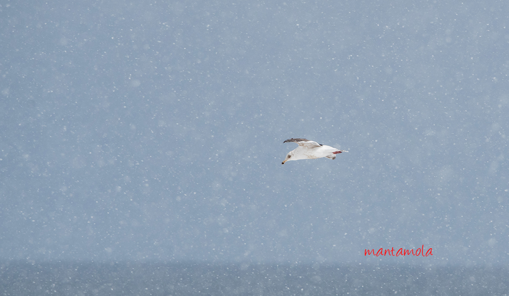 Slaty-backed gull fly pass during this heavy snow.